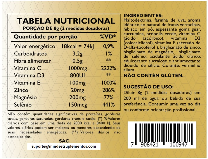 Nossa fórmula única contém cúrcuma, conhecida por suas potentes propriedades anti-inflamatórias, além de própolis verde e hibisco em pó, que reforçam suas defesas naturais e ajudam a combater o estresse oxidativo. A farinha de uva adiciona antioxidantes extras, promovendo a saúde das células.